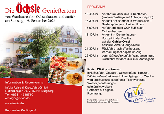 Freuen Sie sich auf ein 3-Gänge-Menü, ein exklusives Konzert auf der berühmten Gabler Orgel und eine komfortable Busfahrt ab/bis Allgäu.