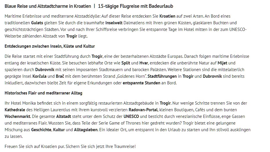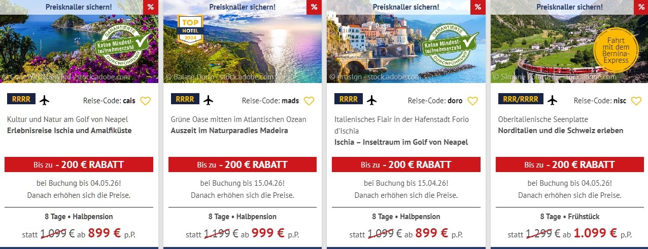 Besonders gefragt sind saisonale Reisen wie Weihnachtsmärkte, Frühjahrsreisen, Sommerurlaub und Herbstangebote.
